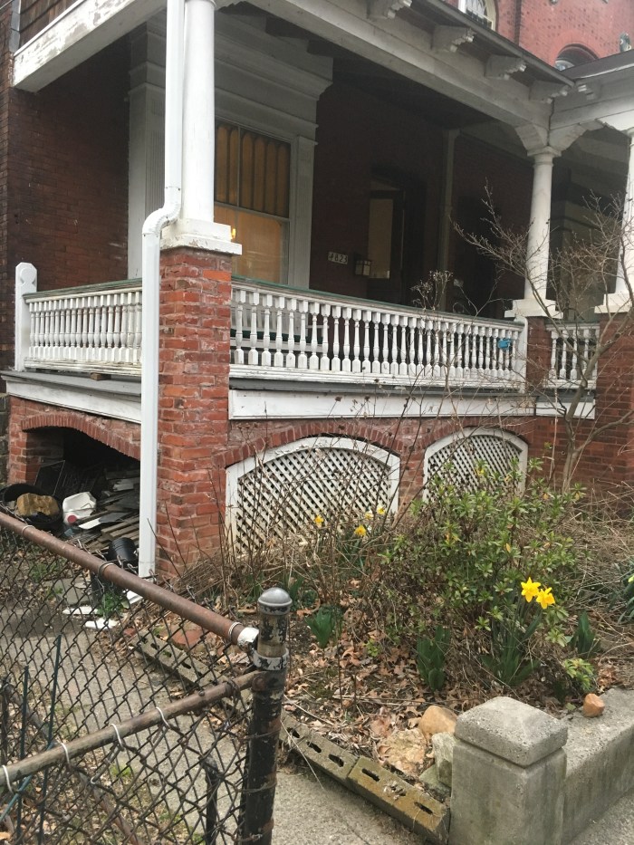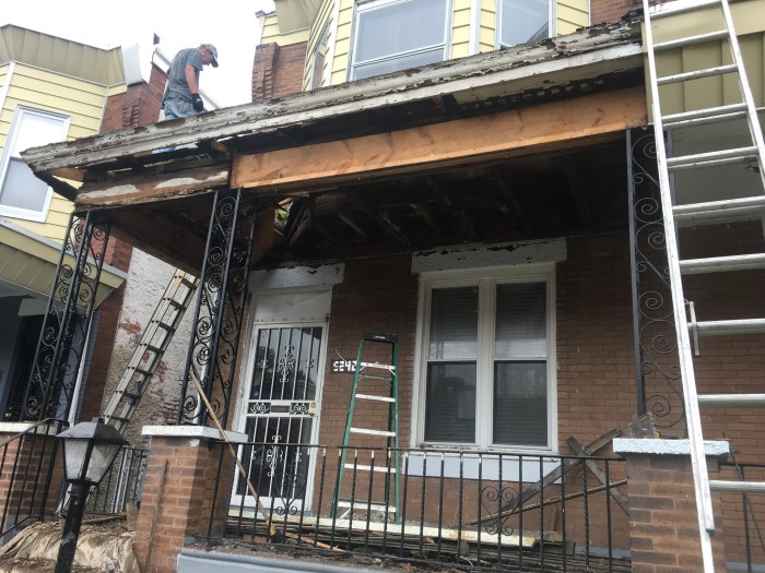 Residential facade, West Philadelphia. Rebuilt front porch, 2nd floor bay windows and cornice. Custom made columns, capitals and moldings.